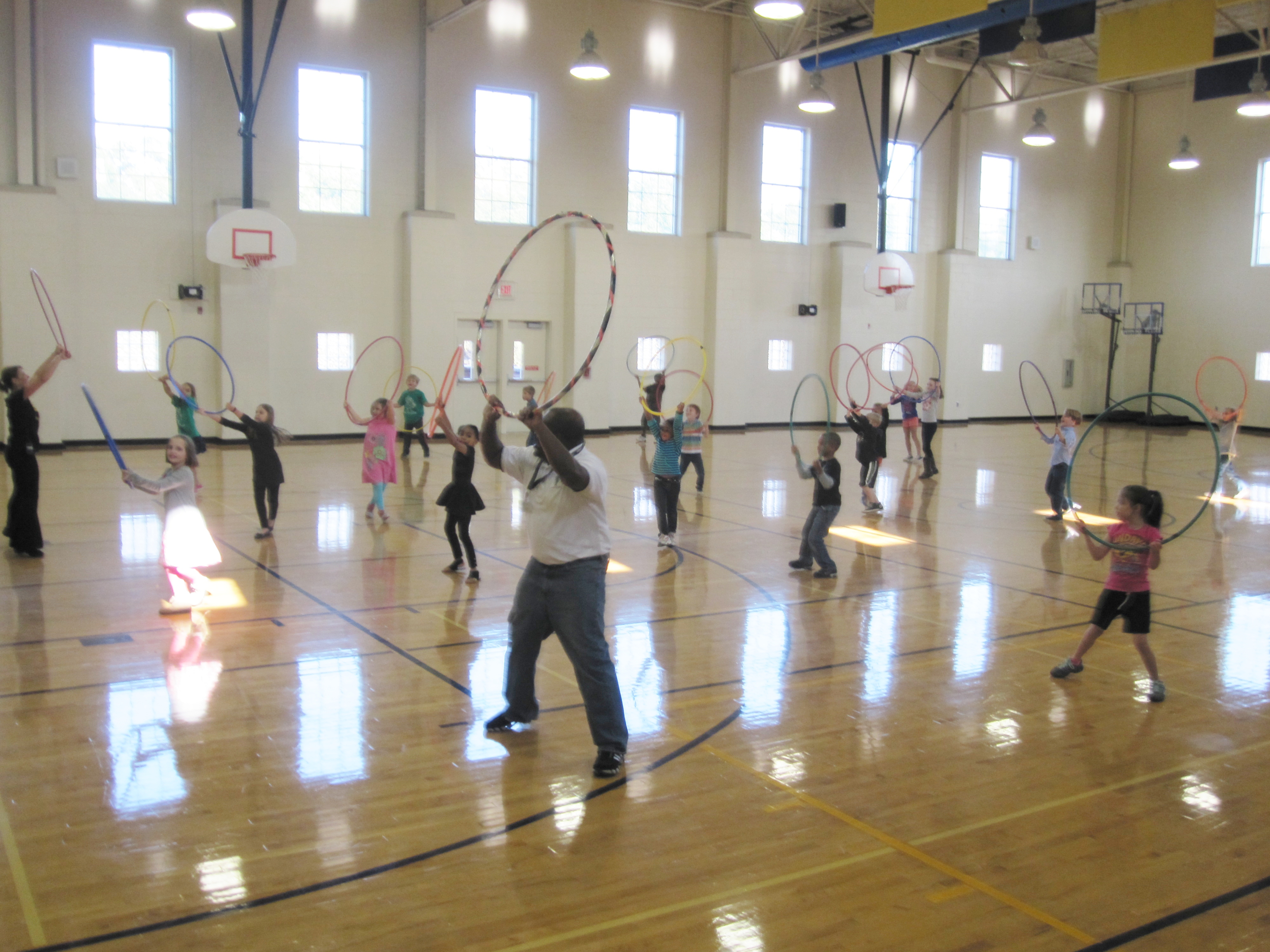 Instructor brings all hula-hoop equipment and portable sound system to the school.